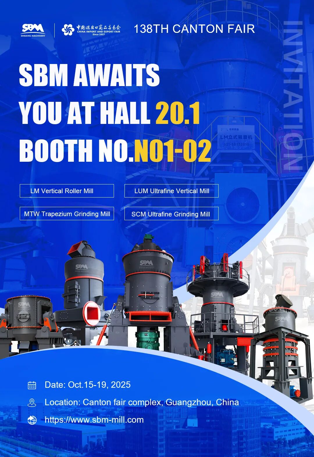 SBM sincerely invites you to attend the 138th China Import and Export Fair and gather with us at booth N01-02, Hall 20.1, jointly exploring green innovation and intelligent future in the field of grinding equipment.